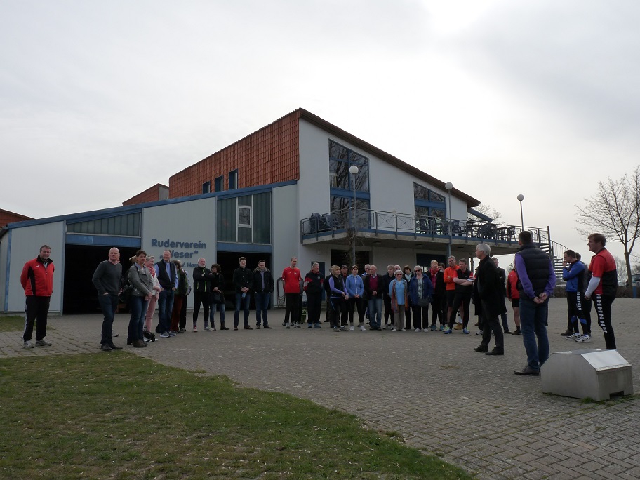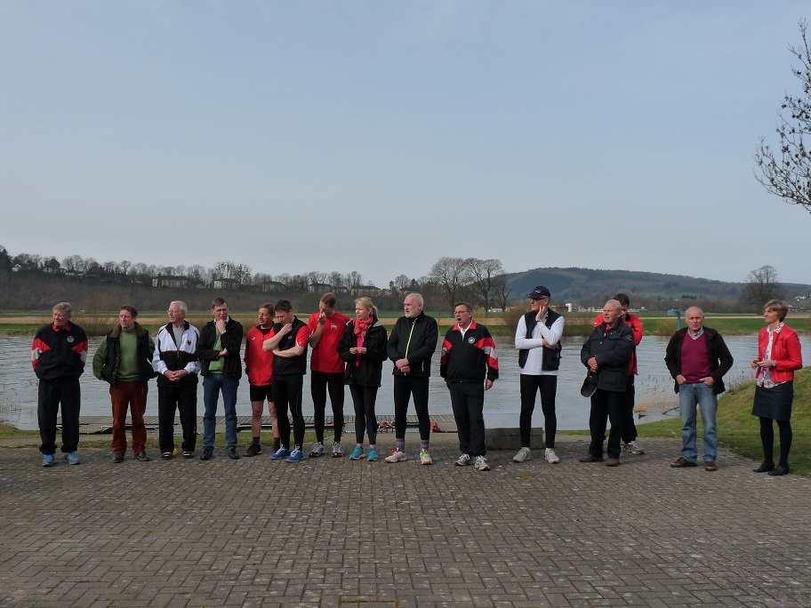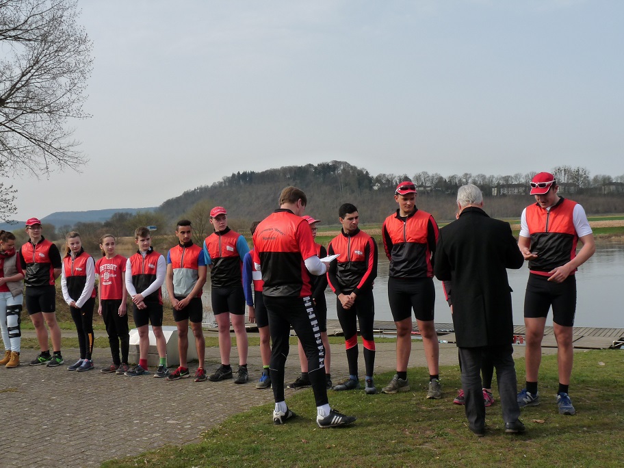 Bereits im Januar wurde die Wettkampfsaison mit der Teilnahme einiger Kinder und Jugendlichen am Ergo-Wettkampf in Hannover eröffnet. Im März waren in Amsterdam sowohl der Ruderbundesliga-Achter beim Heineken-Cup und eine Woche später zwei Mastersmannschaften (ein Männerdoppelvierer mit Steuermann sowie ein Frauenachter in Renngemeinschaft mit drei Hannoveraner Ruderinnen) beim Head of the River Amstel am Start. Nun beginnt auch die Wettkampfsaison für die Trainingsruderer. Verletzungsbedingt müssen allerdings Maximilian Gümpel, Niklas Hölscher und Joelle Edler pausieren und können wohl erst zu den Herbstregatten wieder aktiv werden. Kaya Treder hingegen absolvierte zeitgleich zum Anrudern in Leipzig die Frühjahrs-Langstrecke über 6 km im Juniorinnen A-Einer. Auch alle anderen Trainingsruderinnen und -ruderer haben bereits etliche Kilometer im Boot errudert und fiebern der ersten Regatta in Bremen entgegen. Stellvertretend für die rund 30 Anwesenden verlas Yassin Legien die Trainingsverpflichtung.