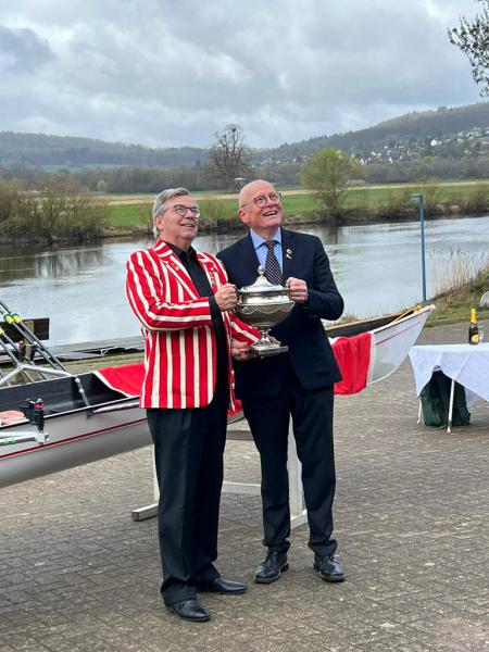 Auch die Wanderruderer und -ruderinnen wurden nicht vergessen. Ruderwart Werner Steding überreichte die Fahrtenabzeichen sowie den Pokal für die Kilometersieger 2025. Er konnte sich für den Verein auch wieder über den Gewinn des Kaiser-Wilhelm-Pokals freuen, den Karl-Friedrich Meyer als Vorsitzender des Nordwestdeutschen Regattaverbandes übergab.